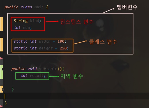 멤버변수 : 모든 인스턴스에 공통으로 사용되는 클래스 변수.
