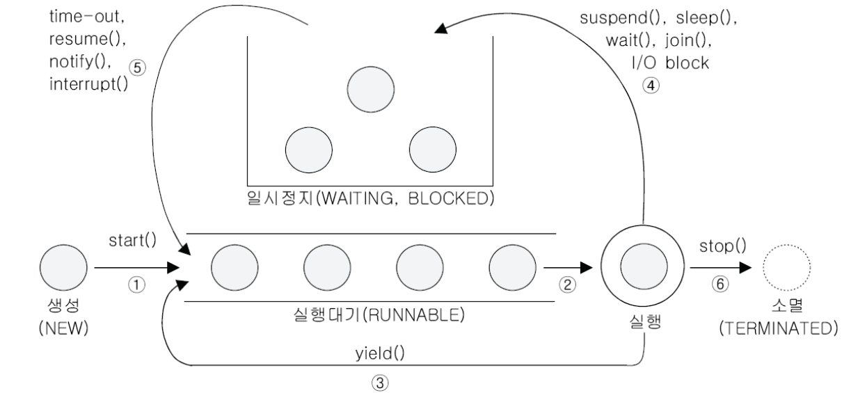 - 지정된 일시정지가 다되거나 5번 메서드가 호출되면 일시정지상태를 벗어나 다시 실행대기열에 저장되어 자신의 차례를 기다린다.