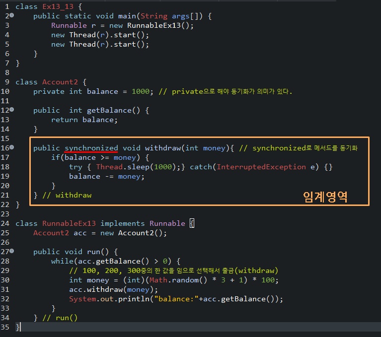 : 한 쓰레드가 진행 중인 작업을 다른 쓰레드가 간섭하지 못하도록 막는 것을 '쓰레드의 동기화(synchronization)'