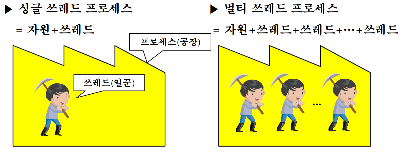 프로세스의 자원을 이용해서 실제로 작업을 수행하는 것이 바로 쓰레드이다.