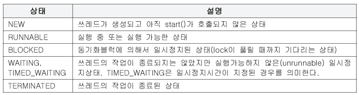 : 쓰레드는 생성된 후부터 종료될 때까지 여러 상태를 가질 수 있다.