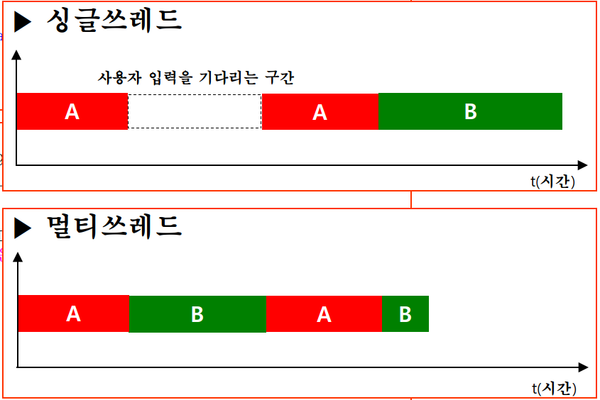 입력작업(a)와 출력작업(b)를 하나의 쓰레드로 처리하면 입력이 끝날 때까지 출력 작업은 실행되지 않는다.
