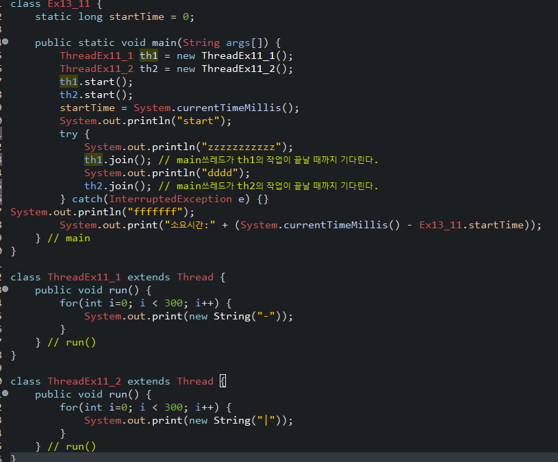 join을 사용하지 않았으면 main쓰레드가 바로 종료되어 작업소요시간을 체크할 수 없지만 join을 사용하여 main쓰레드가 th1,th2쓰레드가 작업을 마칠 때 까지 main스레드를 기다리게 했기 때문에 작업시간을 체크할 수 있었다.