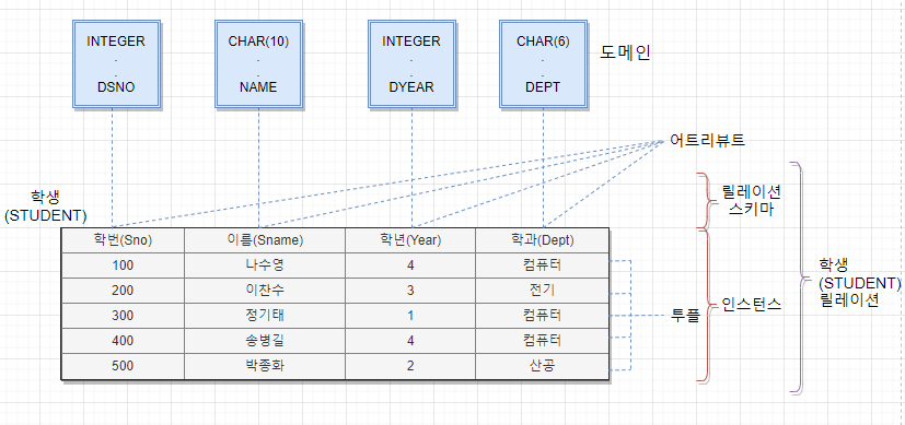 : 데이타베이스, 데이타베이스 관리 시스템(DBMS: DataBase Management System), 시스템과의 인터페이스를 제공하는 도구로써의 데이타 언어, 데이타베이스 사용자, 관리자, 컴퓨터