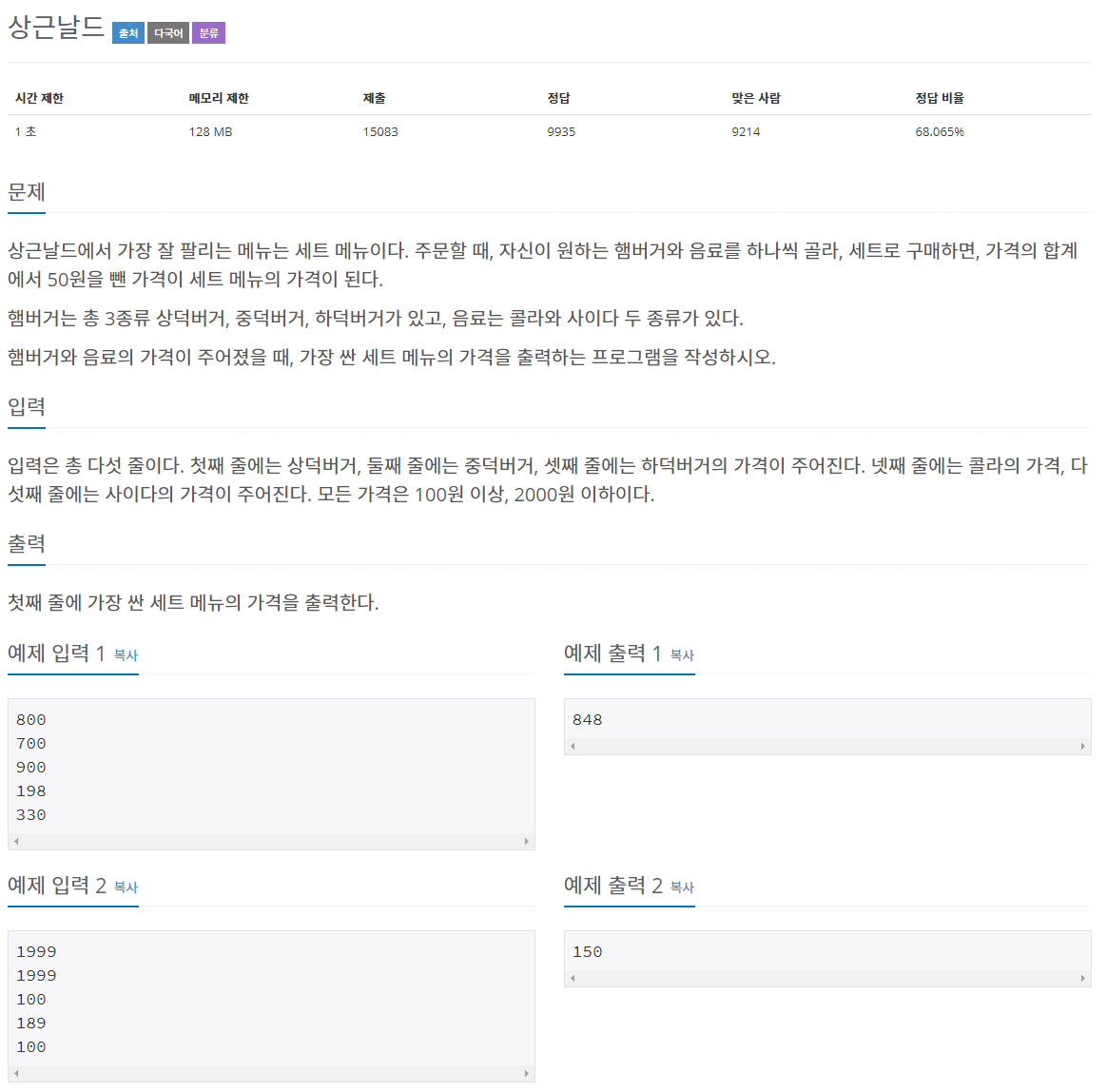 버거와 음료의 최솟값을 찾아주면 되는 문제이다.