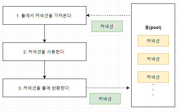 데이터베이스와 연결된 커넥션을 미리 만들어서 풀(pool) 속에 저장해 두고 있다가 필요할 때에 커넥션을 풀에서 가져다 쓰고 다시 풀에 반환하는 기법을 의미한다.