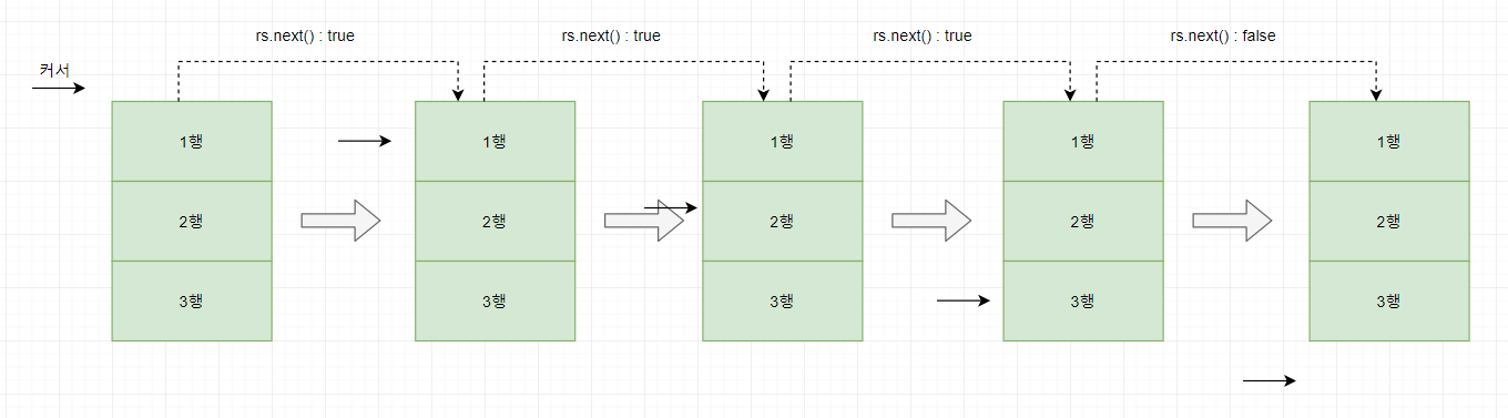 최초의 커서는 1행 이전에 존재한다. 마지막 행에 커서가 도달하면 next 메서드는 false 를 리턴한다.
