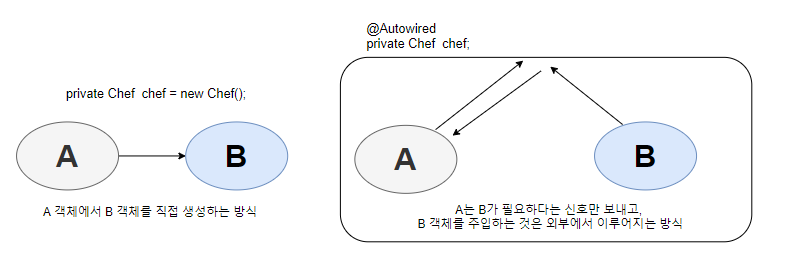 스프링에서는 'ApplicationContext'라는 존재가 필요한 객체들을 생성하고, 필요한 객체들을 주입하는 역할을 해 주는 구조이다. 따라서 스프링을 이용하면 개발자들은 기존의 프로그래밍과 달리 객체와 객체를 분리해서 생성하고, 이러한 객체들을 엮는(wiring) 작업을 하는 형태의 개발을 하게 된다.