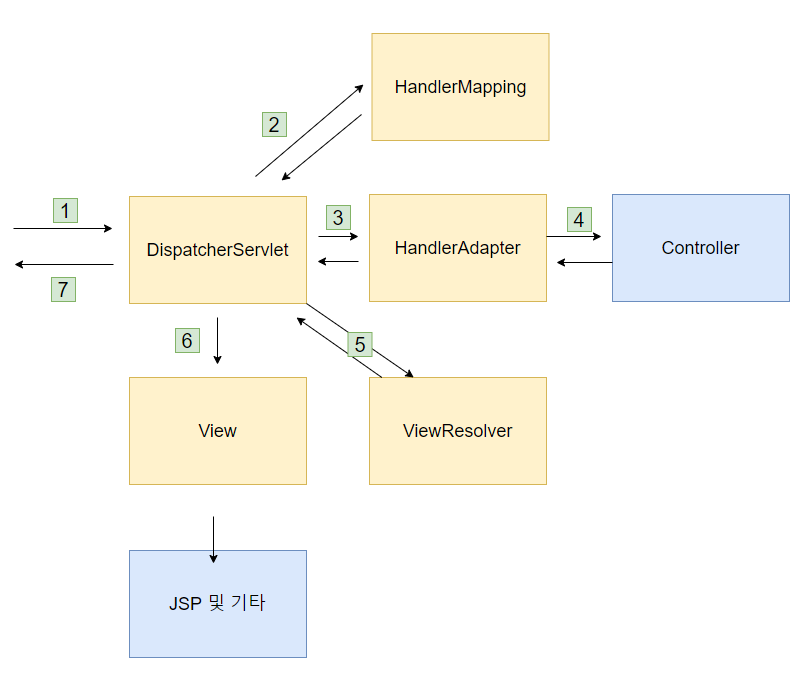 1. 사용자의 Request는 Front-Controller인 DispatcherServlet을 통해서 처리
