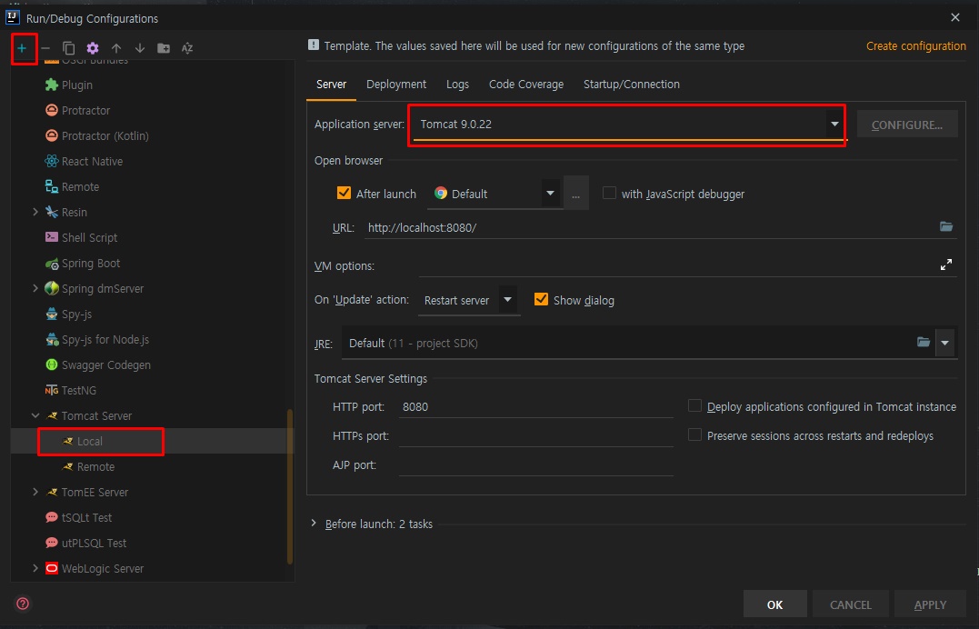 Intellij의 경우 Tomcat을 설정하고, 프로젝트의 실행에 Tomcat에 프로젝트를 추가하는 방식을 이용한다.