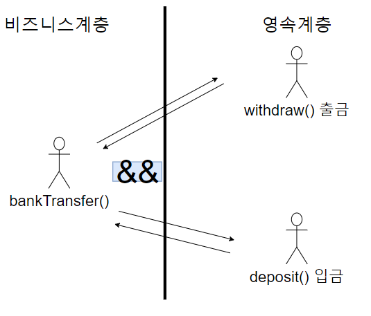 영소계층에서 '출금'과 '입금'은 각각 데이터베이스와 연결을 맺고 처리하는데 하나의 트랜잭션으로 처리해야 할 경우에는 한쪽이 잘못되는 경우에 이미 성공한 작업까지 다시 원상태로 복구되어야 한다.