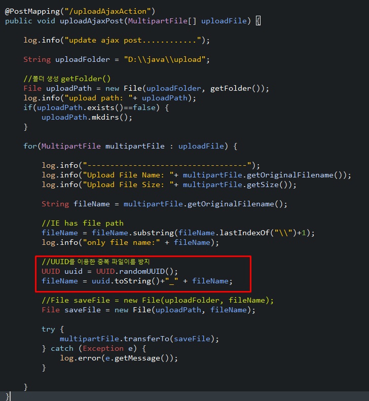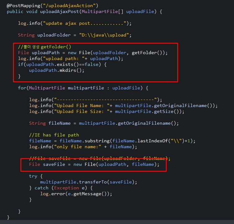 파일의 저장은 transferTo() 메서드를 이용해서 처리할 수 있다.