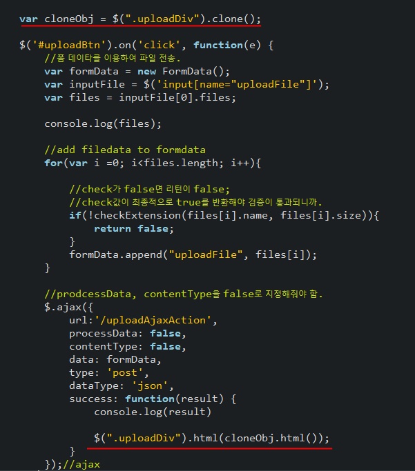 첨부파일을 업로드한 뒤에는 복사된 객체를 div 내에 다시 추가해서 초기화시켜준다.